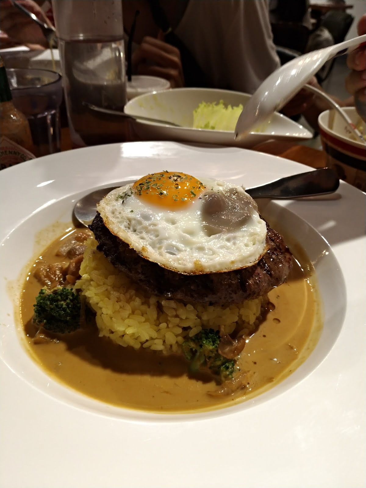 薑黃風味飯,放上很有厚度的牛肉漢堡排,非常juicy